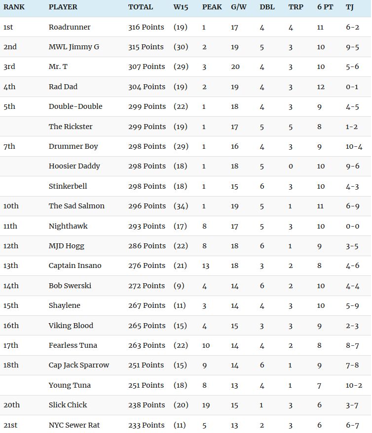 Here is a copy of the Week 15 Current Standings for those who are having trouble viewing it on their screens (usually due to viewing site on cell phone or tablet). Remember that there is much more detailed information that can be read on the actual Current Standings Page (but using a computer is necessary due to the tables).