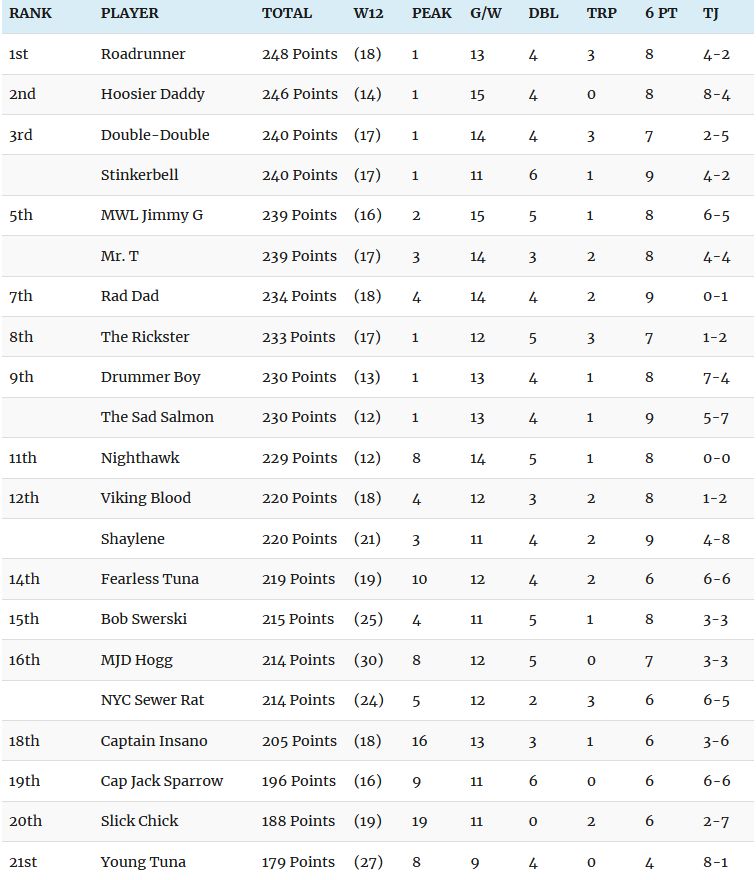 Here is a copy of the Week 12 Current Standings for those who are having trouble viewing it on their screens (usually due to viewing site on cell phone or tablet). Remember that there is much more detailed information that can be read on the actual Current Standings Page (but using a computer is necessary due to the tables).