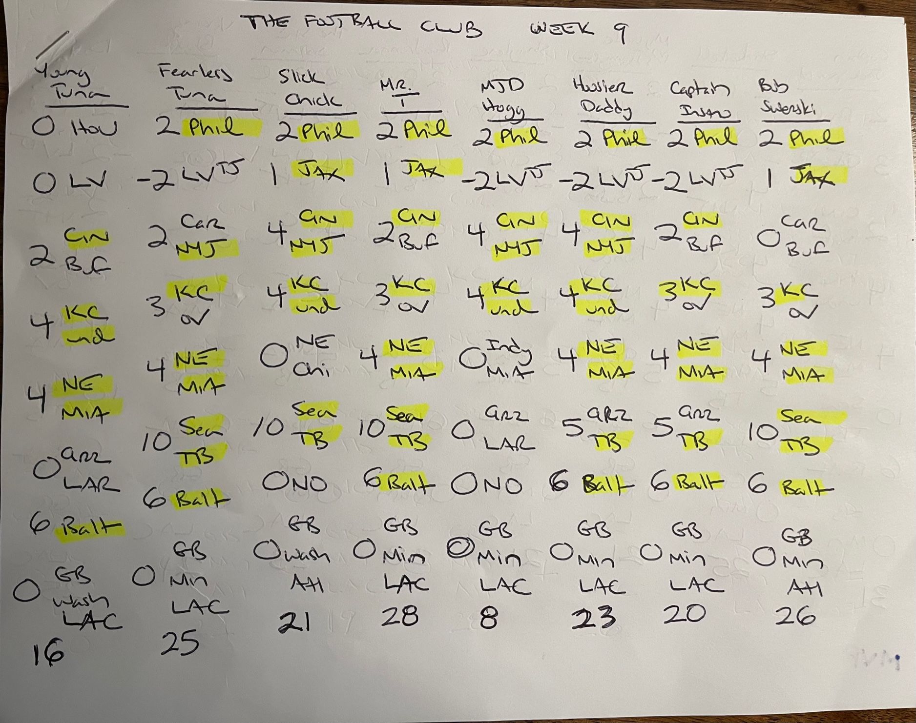 Week 9 full picks now posted. (Sat 11:20pm). All players are welcome to view my picks once they have turned their own in for the week.