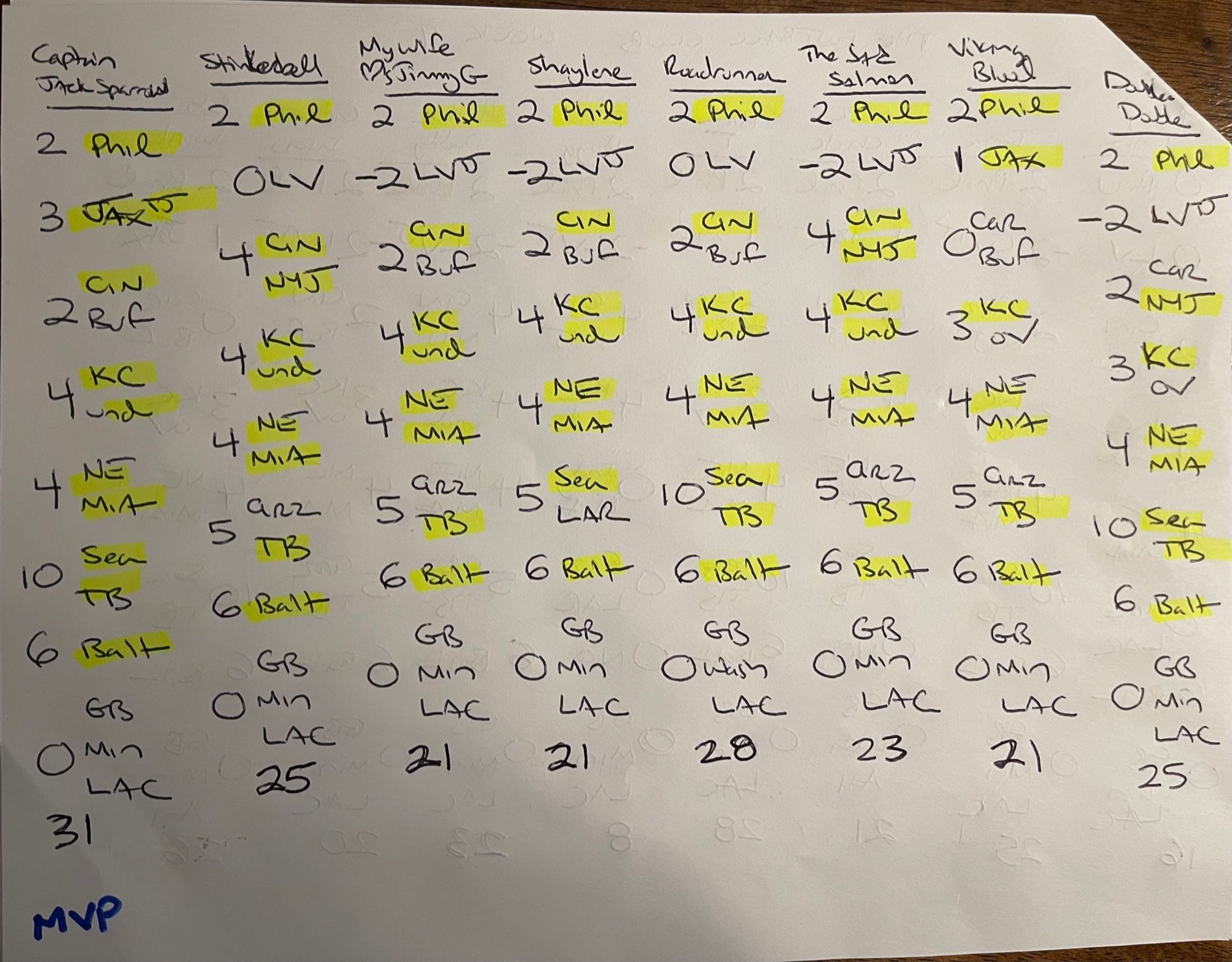 Here are the club’s picks for Week 9. Captain Jack Sparrow wins the MVP Award with 31 Points. And three players tie for the MVP Award Runner-Up with 28 Points: Nighthawk, Roadrunner & Mr. T.