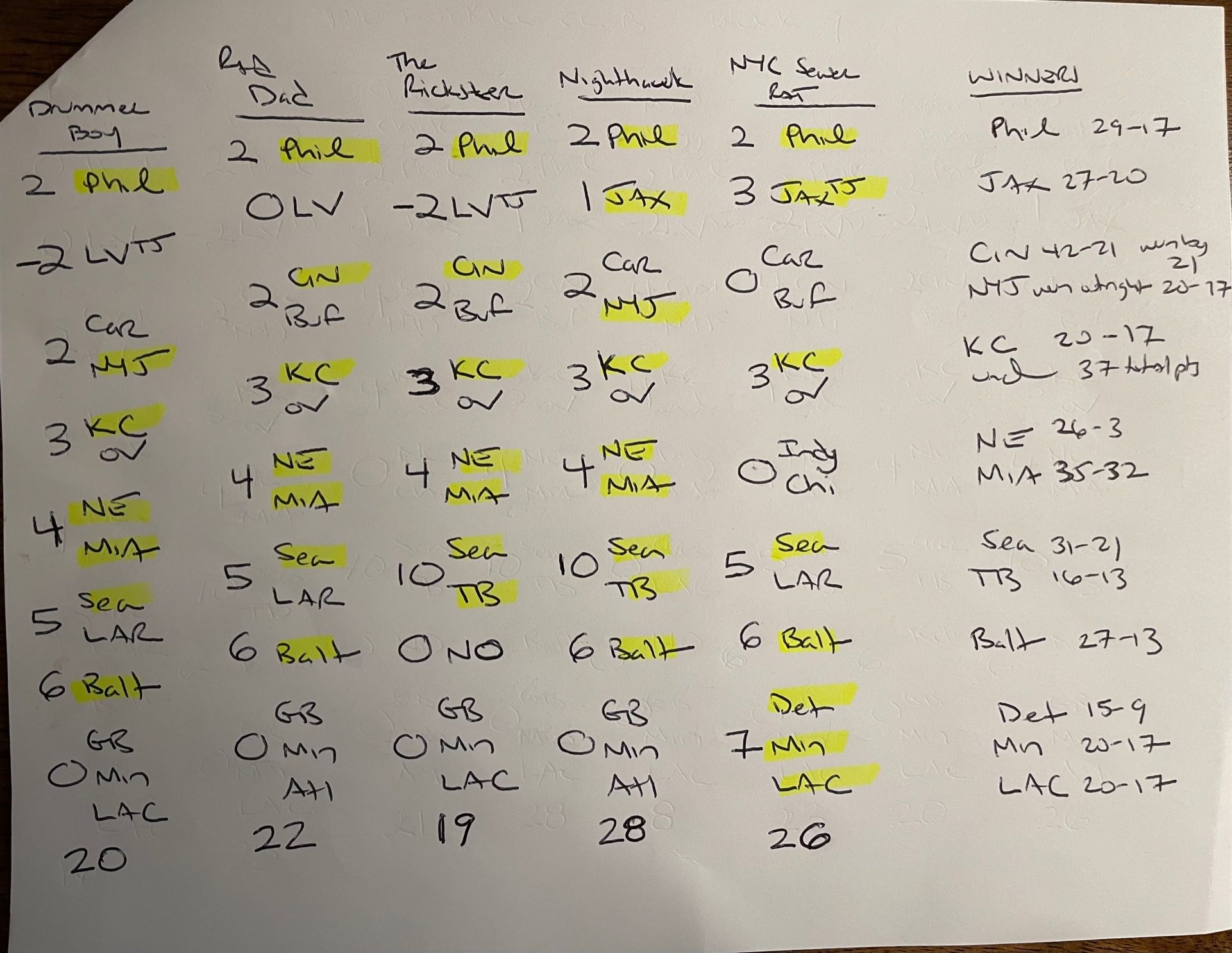Week 10 full picks now posted. (Sat 10:00am). All players are welcome to view my picks once they have turned their own in for the week.