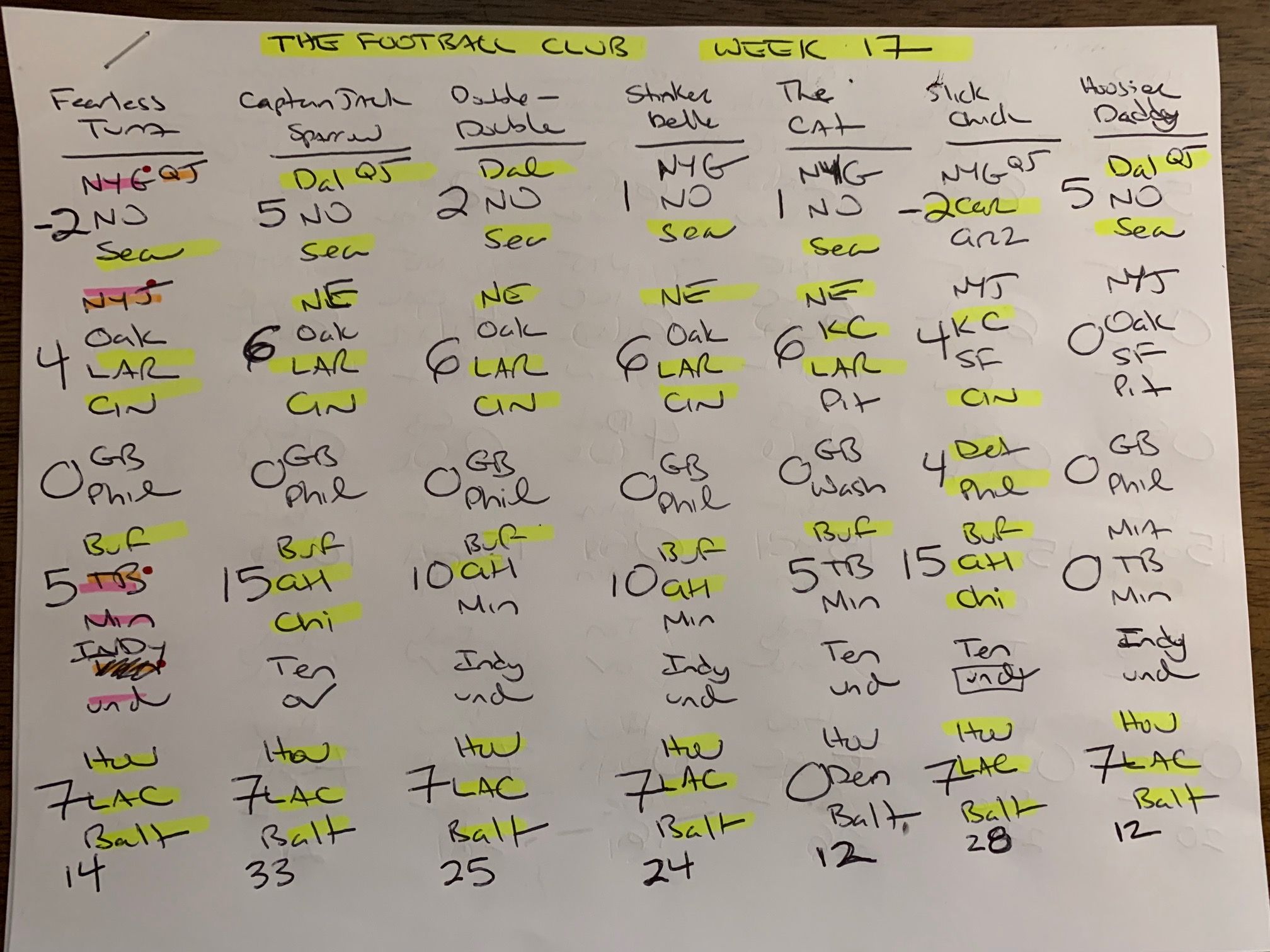 Now that the Sunday night game has started, I can show what everyone in the club picked for Week 17.  Note that the scores at the bottom of the pages don’t include the Sunday night game and Over/Under, since that game is currently being played (at the time of this post).
