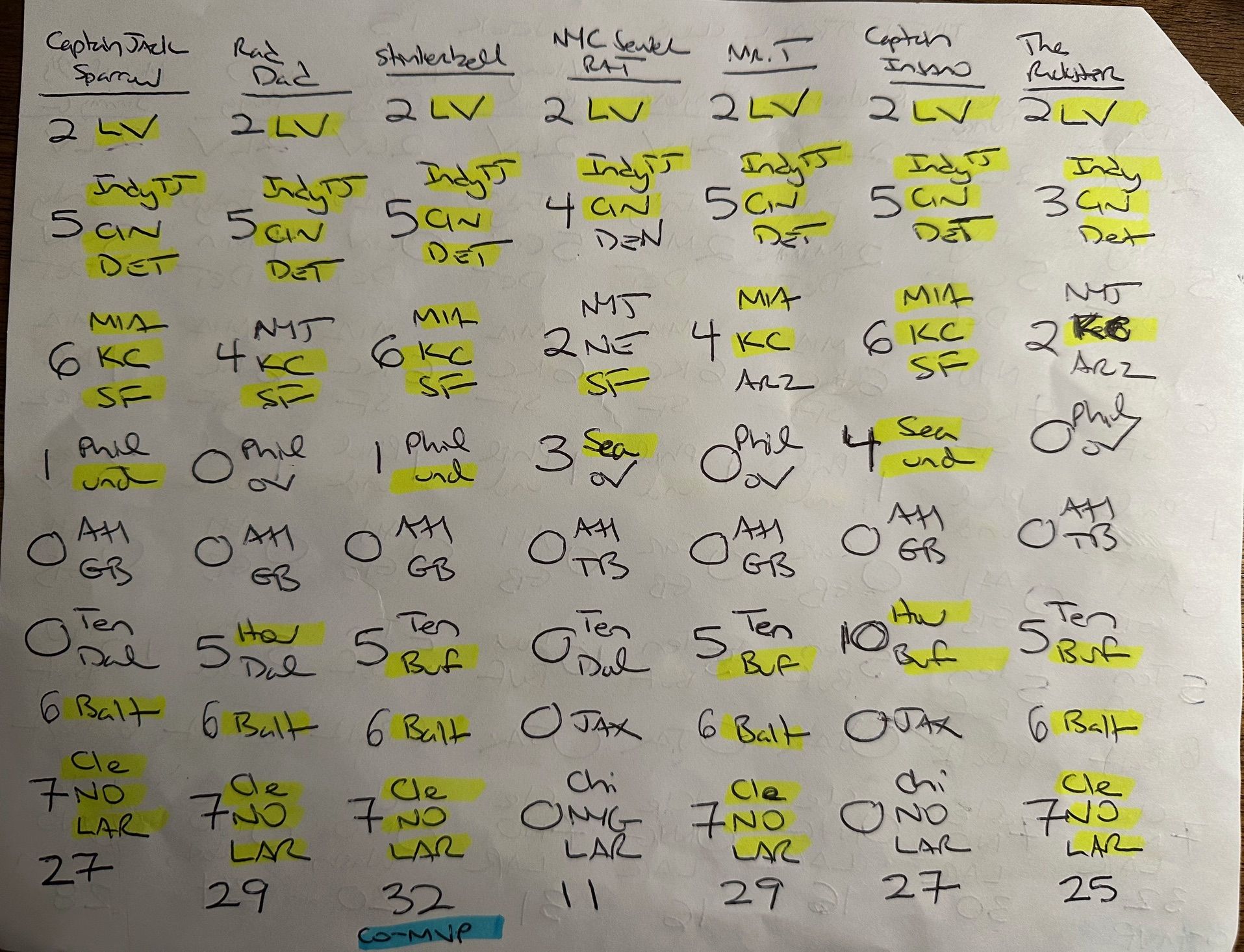 Here are the club’s picks for Week 15. Stinkerbell & Young Tuna share the Week 15 MVP Award with 32 Points, while Viking Blood takes the MVP Award Runner-Up with 31 Points.