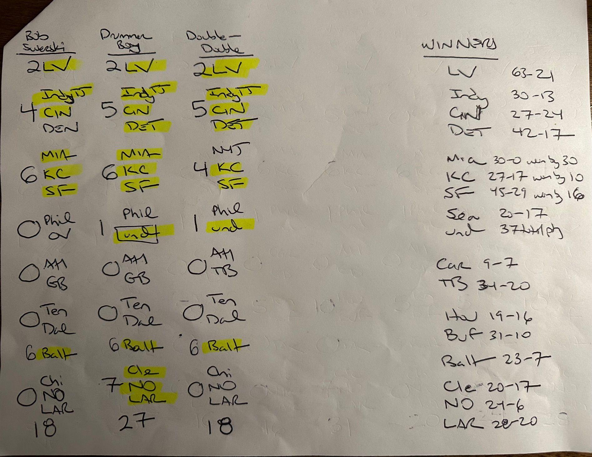 Here are the club’s picks for Week 16. Fearless Tuna & My Wife Loves Jimmy G share the Week 16 MVP Award with 27 Points, while Double-Double takes the MVP Award Runner-Up with 25 Points.