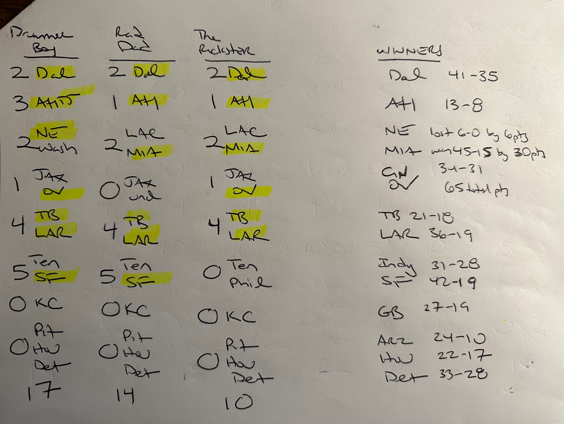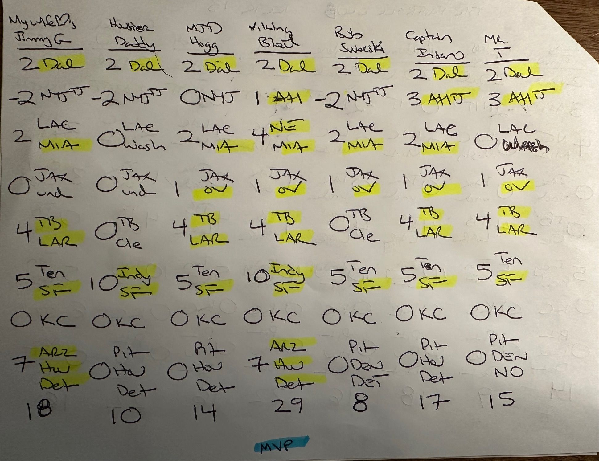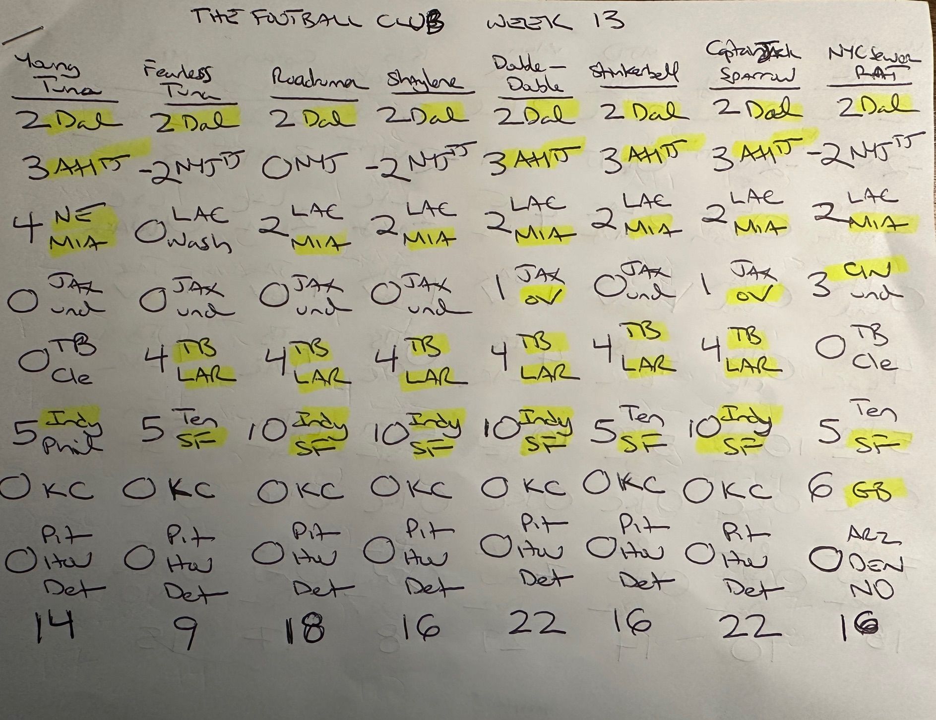 Wild Animals teammates My Wife Loves Jimmy G & Double-Double both scored 32 Points last week to share the Week 14 MVP Award. For My Wife Loves Jimmy G, it has been a somewhat frustrating season. He stated at a press conference that his “instincts have been off all year”. My Wife Loves Jimmy G’s wife was also no doubt frustrated when her favorite player Jimmy Garoppolo was benched in Las Vegas. But they both finally have something to cheer about as My Wife Loves Jimmy G put together a huge week in the club including being 1 of only 5 players to correctly pick TB with TJ. As a result, My Wife Loves Jimmy G has returned to the Top Ten after spending a couple of weeks languishing in 13th Place. He is now in 9th Place, only 13 Points away from breaking into the Top Five for the first time this season. For Double-Double, this MVP Award is validation of his status as a serious contender for the 2023 club title. Double-Double has a streak going of 5 straight Top Five finishes in the Final Standings at the end of each season. The Hall of Fame all-time record is 6 straight Top Five finishes. So Double-Double is well on his was to tying that mark (set by Fearless Tuna from 2006-2011) and then possibly overtaking it next season. But right now, Double-Double’s focus is on continuing to make great picks for the next 4 weeks. Last week, his huge tally included getting both Games of the Week, the Double Stakes, Triple Crown, and Sunday night game correct. This has pushed Double-Double up to a new Peak Position of #2 as he now stands only 6 Points behind Current Leader Drummer Boy. The Week 14 MVP Award Runner-Up was The Rickster, who scored 29 Points. It was nice to see The Rickster have such a great week. We know this has been a rough season and year for him, so we are all happy to see him having some success here in the club. The Rickster did make the one cardinal mistake that should never be done in the club. He made a last second switch on Monday night from his original pick of the NY Giants over to the GB Packers. Of course, the Packers ended up losing (as was virtually guaranteed the moment he made that switch). That’s just how things always seem to turn out with last second switches. Had The Rickster not switched, then he would have shared the MVP Award along with My Wife Loves Jimmy G & Double-Double. And that would have meant that for the first time ever in the club, we would have had all three teammates on a Pro Bowl team win the MVP Award together. But not this time. Even so, Wild Animals combined to score 93 Points this week, which was the Highest Score of the Year in team play. With 4 weeks left, the Current Top Five consists of #1 Drummer Boy (4 Weeks at #1), #2 Double-Double (6 Points back), tied for #3 Captain Jack Sparrow & Roadrunner (12 Points back), and my dear boy #5 Young Tuna (13 Points back). I’m not yet giving up on Young Tuna still having a chance at winning the club title, but he now has some very stiff competition in front of him. Still, 13 Points can and has been made up in a single week, so there is plenty of time left in the season for him to rebound back up the standings.