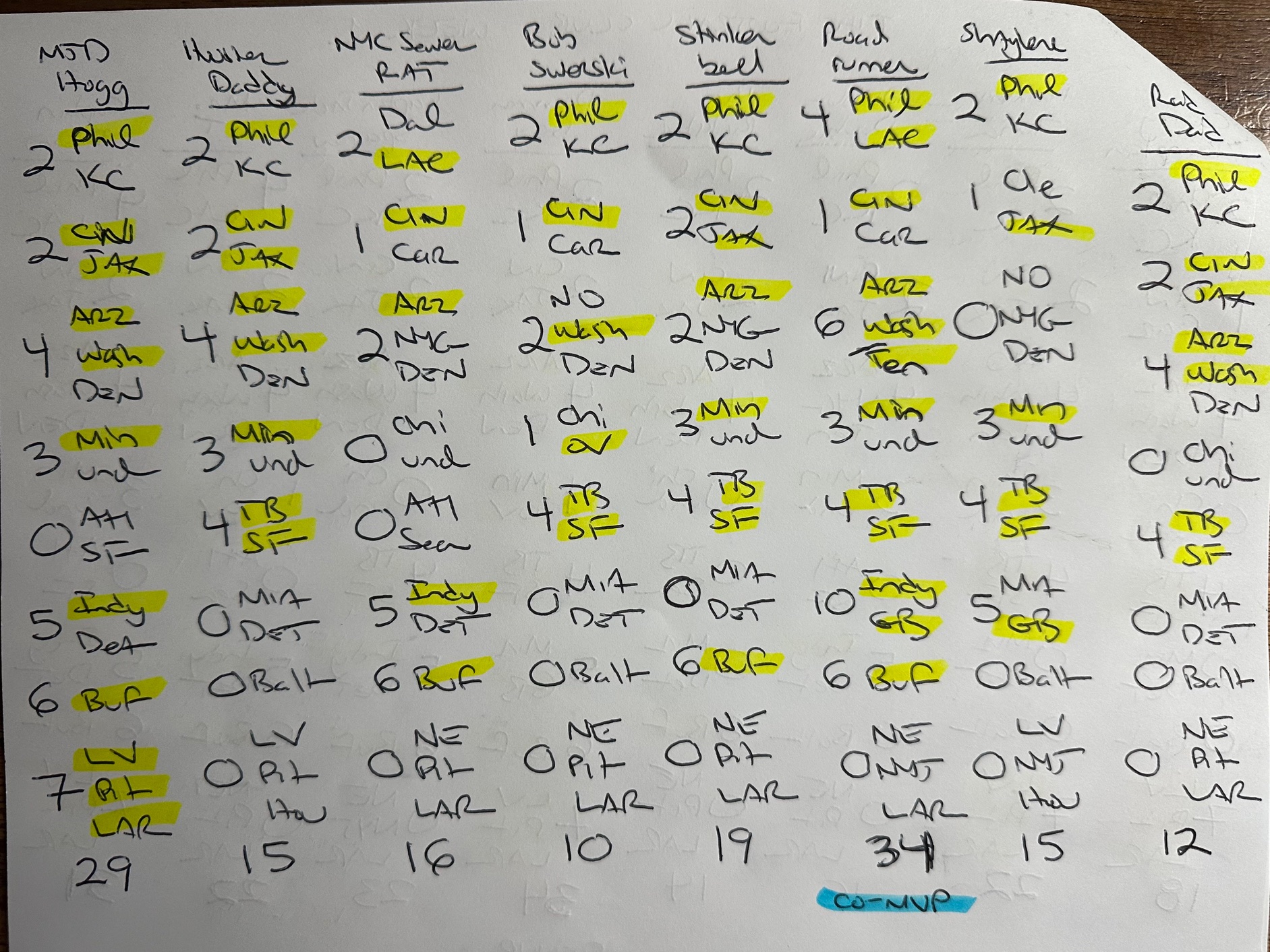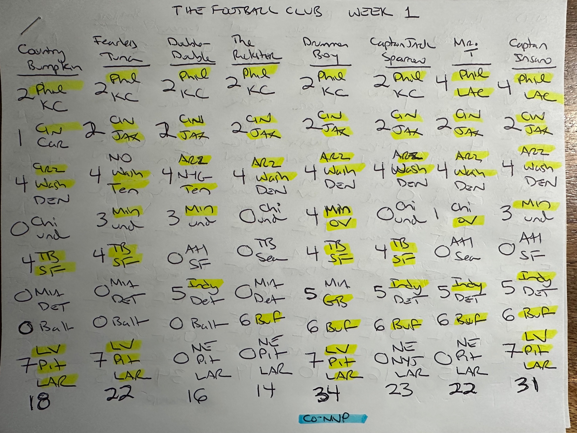 Here are the club’s picks for Week 1. Drummer Boy & Roadrunner share the Week 1 MVP Award with 34 Points, while My Wife Loves Jimmy G claims the MVP Award Runner-Up with 32 Points.