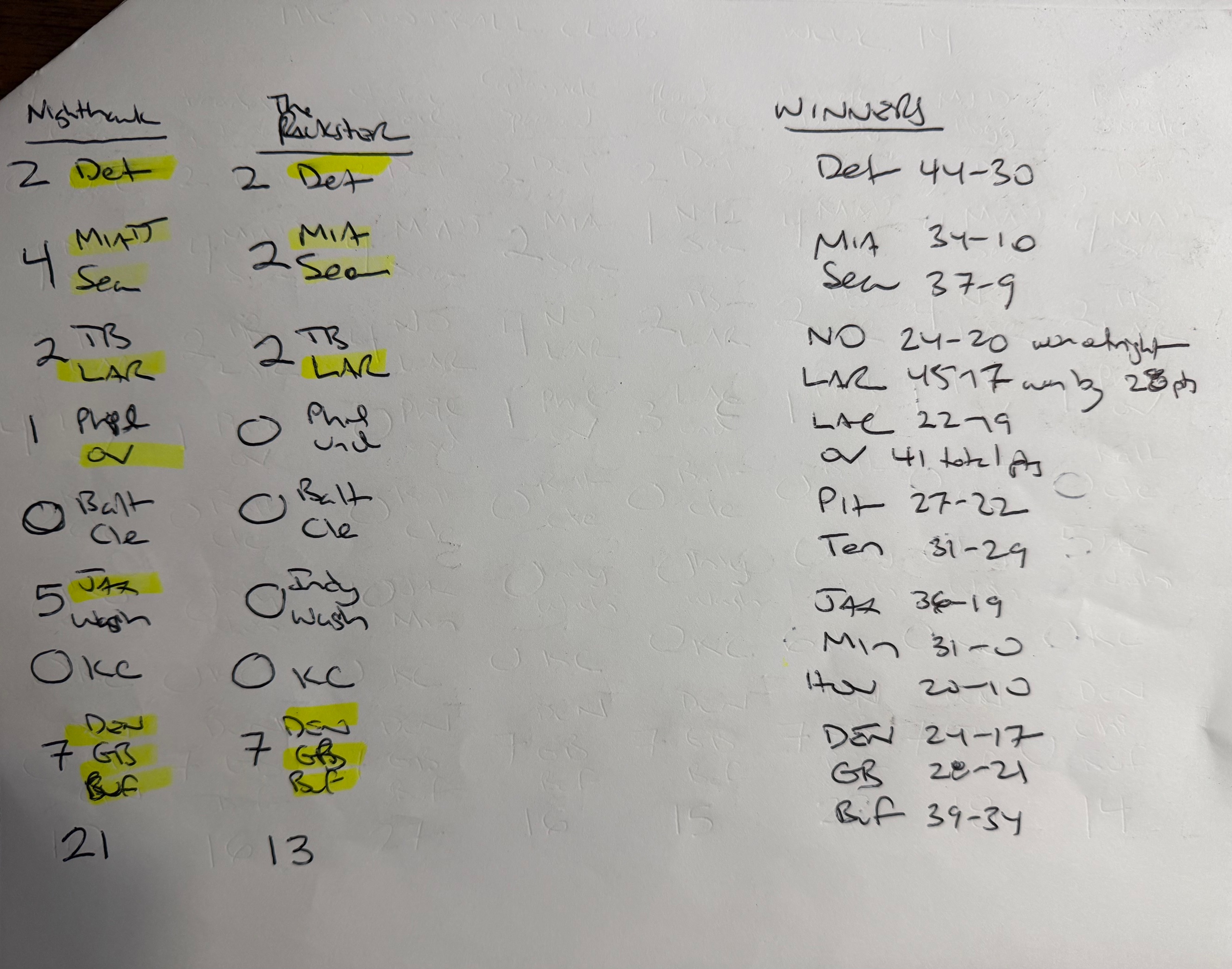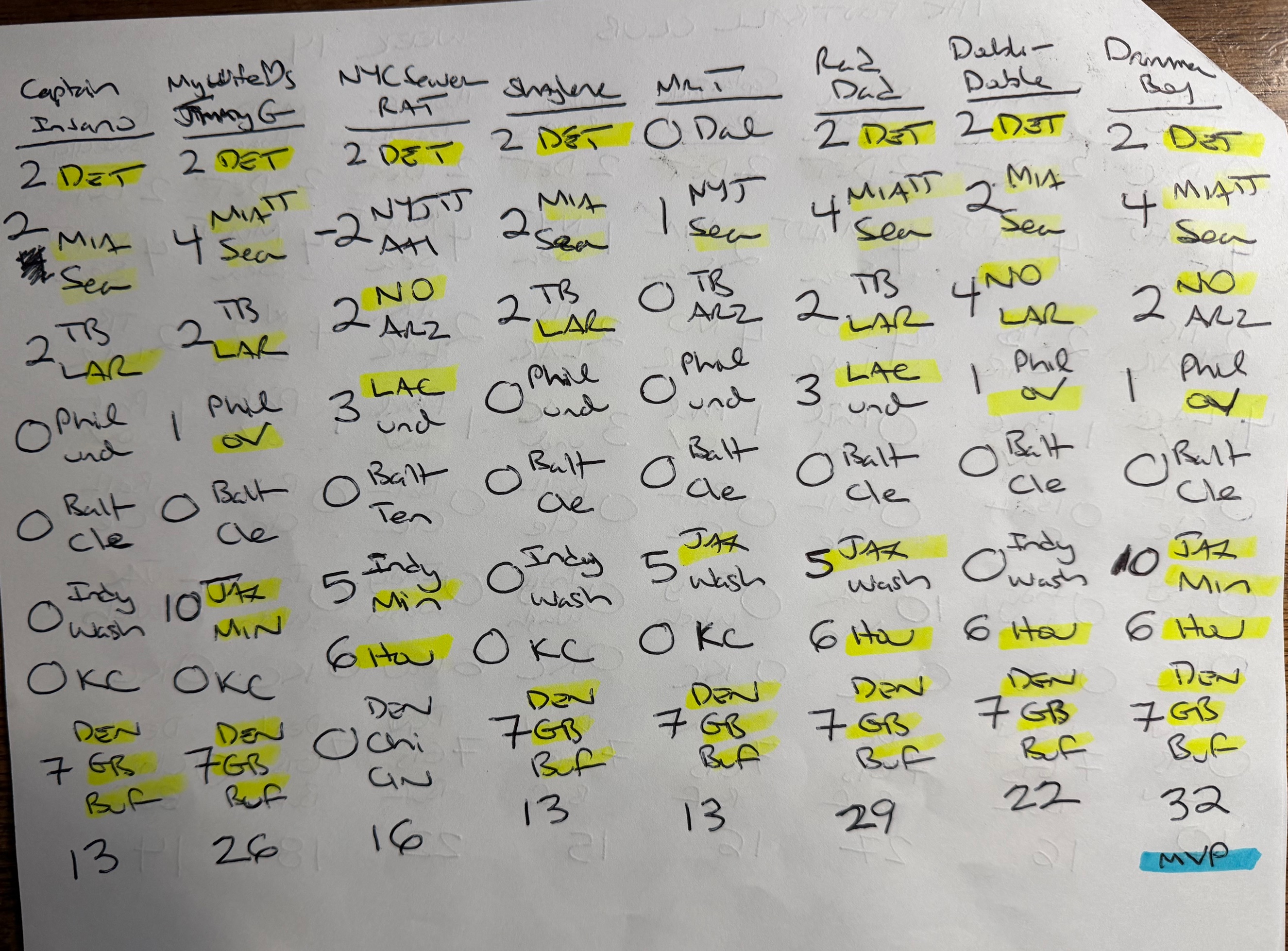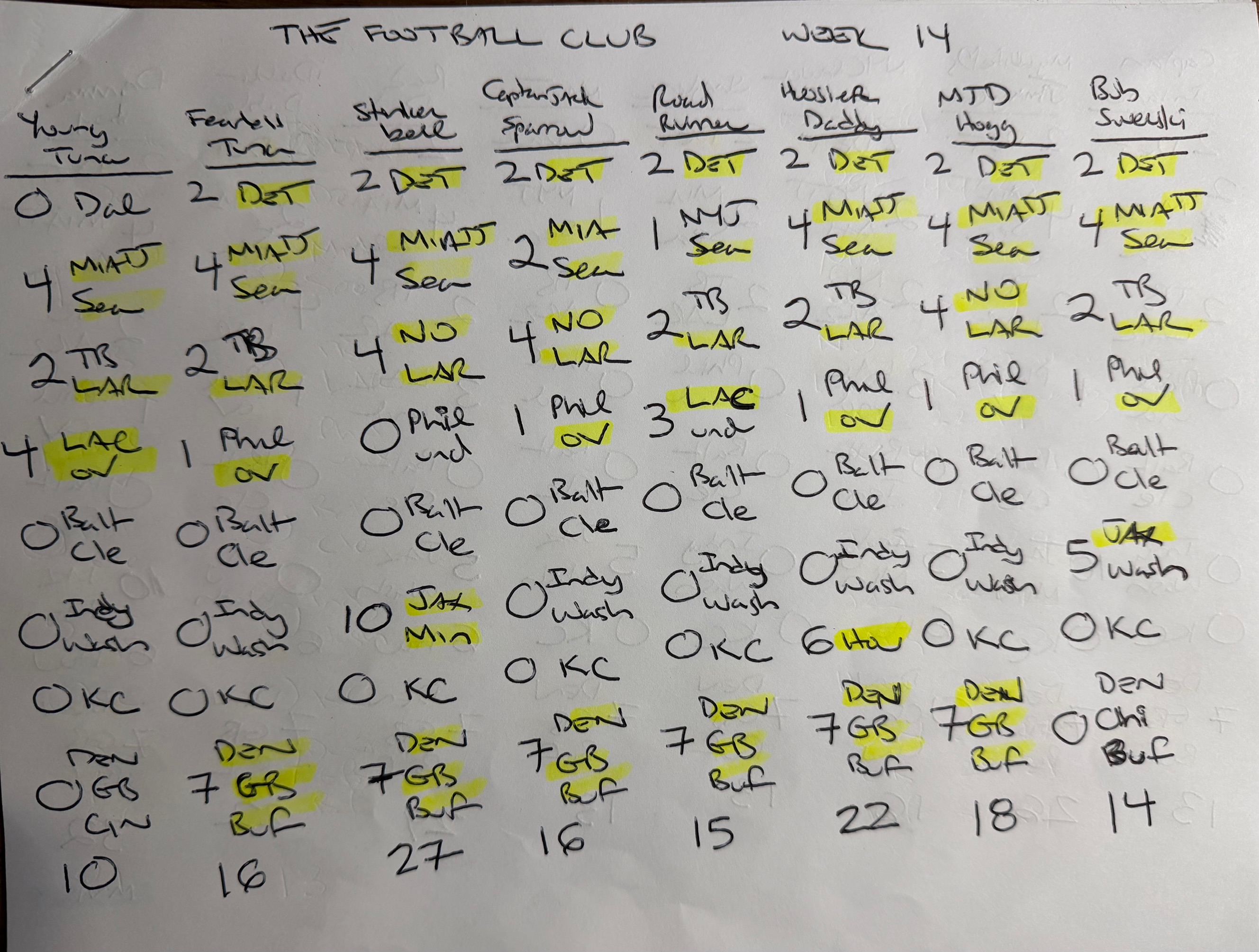 Here are the club’s picks for Week 14. Drummer Boy wins the Week 14 MVP Award with 32 Points, while Rad Dad claimed the MVP Award Runner-Up with 29 Points.